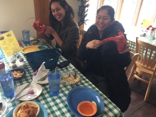 Summer Work Travel participant Astrid Noya Cisneros (of Peru) arrived in the US a few weeks ago. She’s living in snowy Maine, the northernmost state in the New England region of the northeastern United States. Maine is famous for its moose and lobsters, along with a scenic coast and lighthouses. Below Astrid (on left) tries lobster for the first time with fellow SWT participant Nataly, also from Peru.