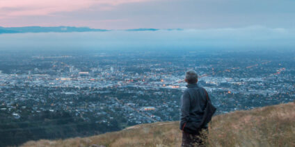 Solo traveler on a hill overlooking a city in New Zealand.